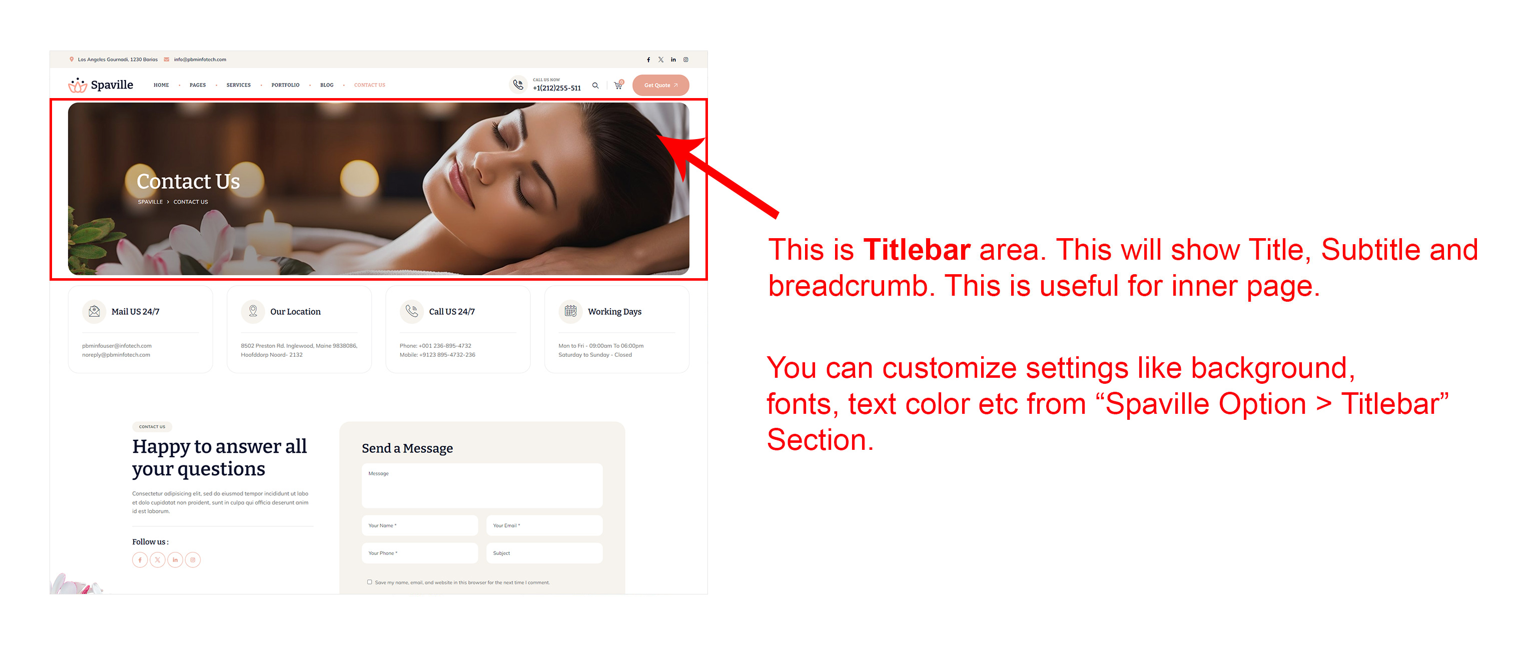 Generally the Titlebar will appear on inner page. This will appear below header area. This will show page title, subtitle and breadcrumb. (Where is Titlebar?)