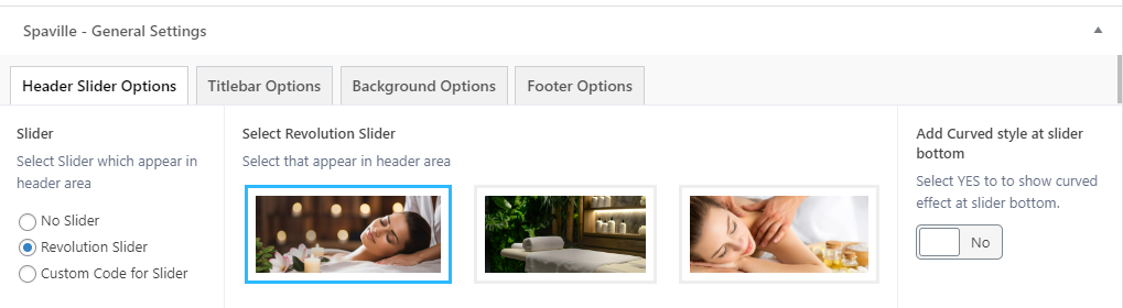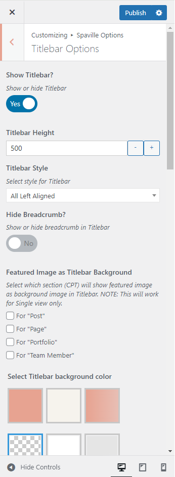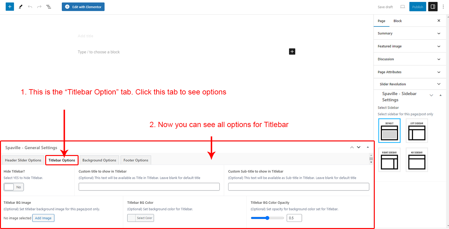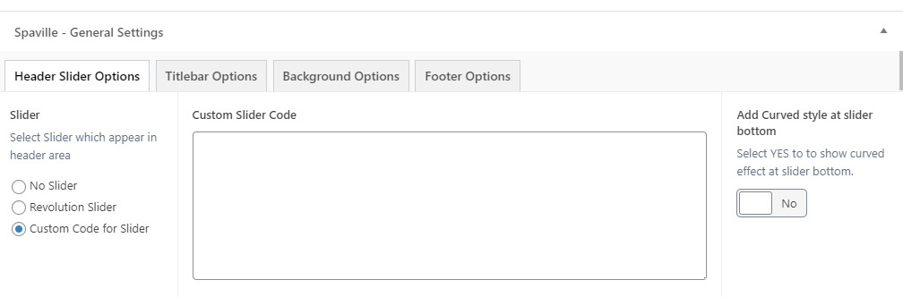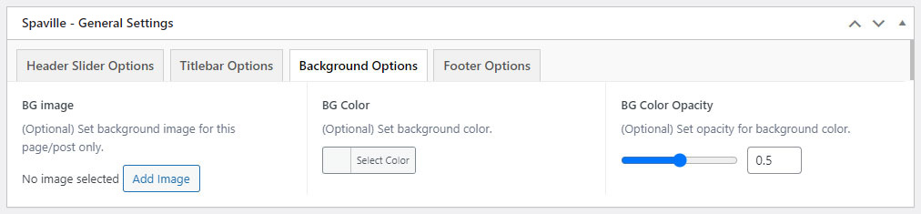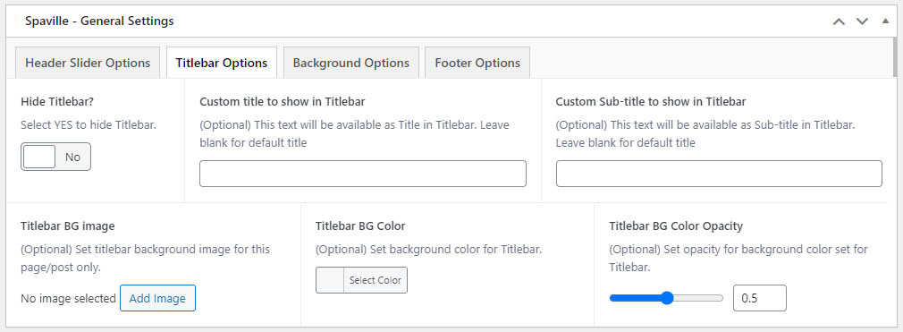This will override the options set under Spaville Options > Titlebar Settings options. This will help you to set special design the Titlebar on specific page or post.