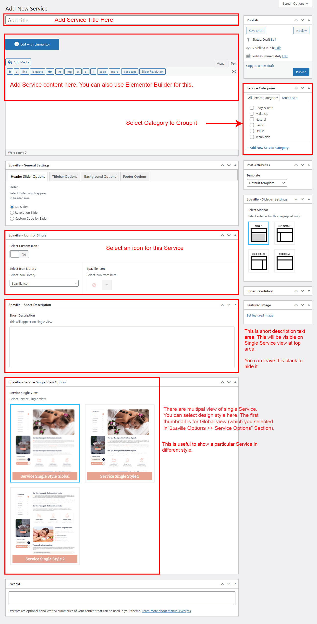 If you already done demo content setup than you can edit existing service and check how we added data so you can understand each option perfectly.