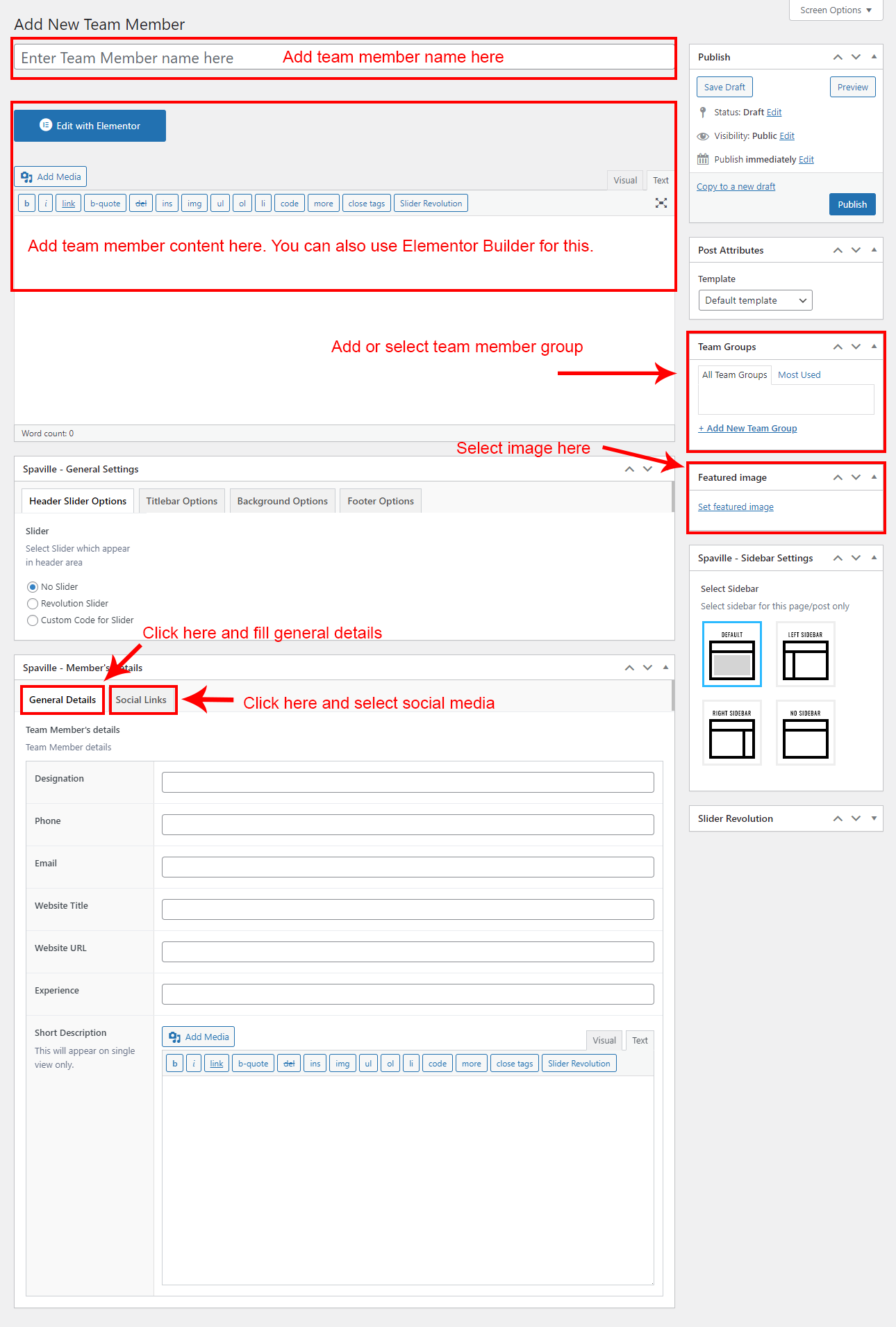 If you already done demo content setup than you can edit existing Team and check how we added data so you can understand each option perfectly.