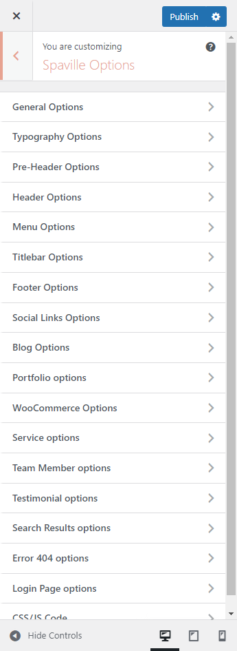 Spaville Options (Theme Options) panel is created with WordPress' Customize section. We added our own options with WordPress' default options.