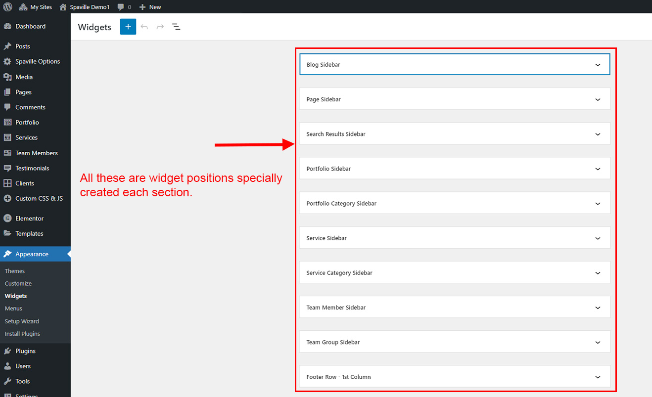 Spaville theme comes with widgets and different positions. We created special widget positions for each section so you can show sidebar and footer widgets properly according to content. Here are description of all widget positions: