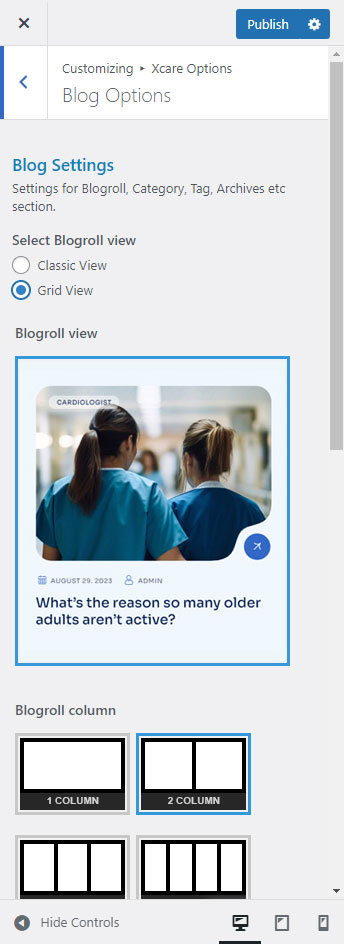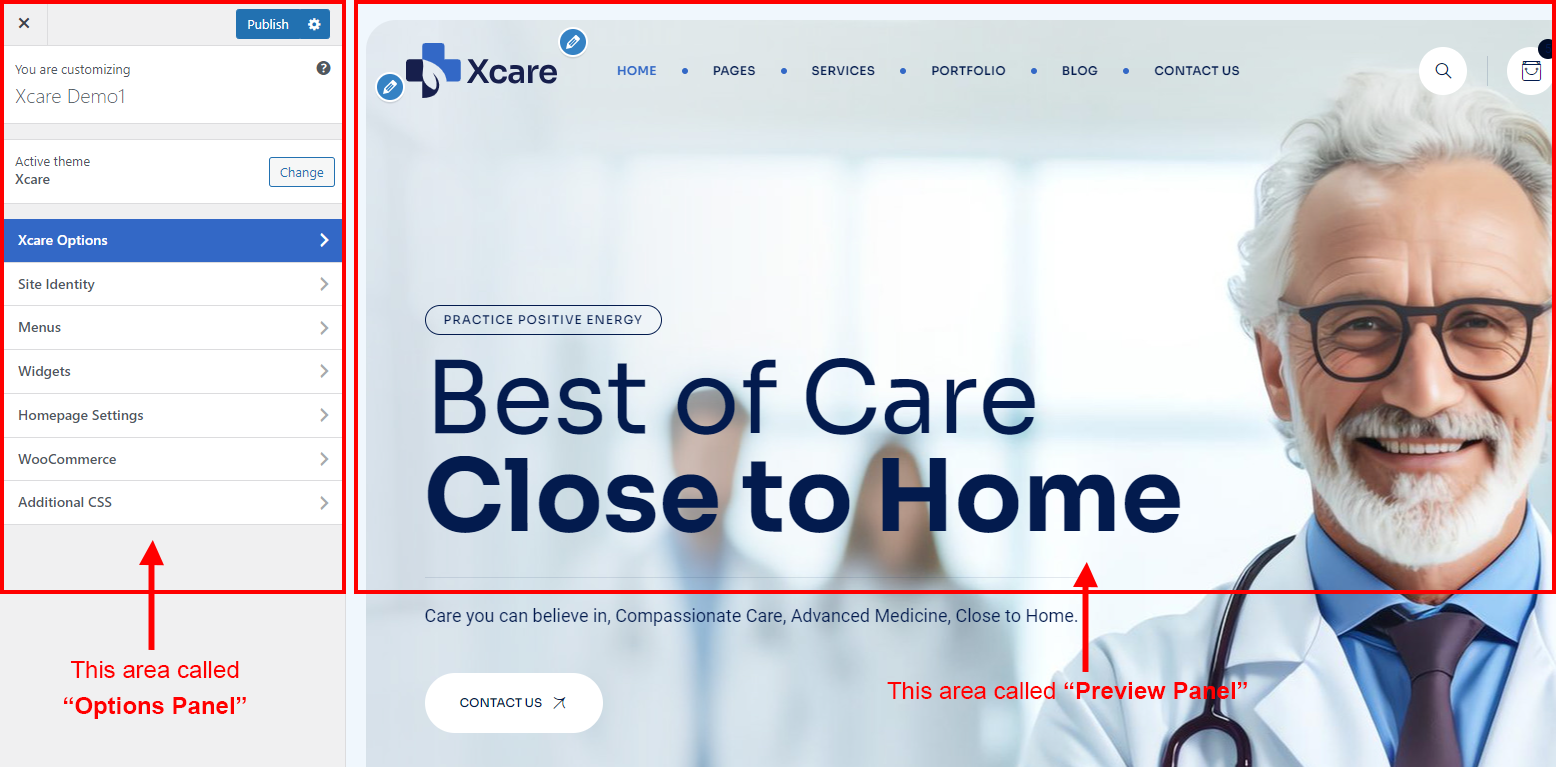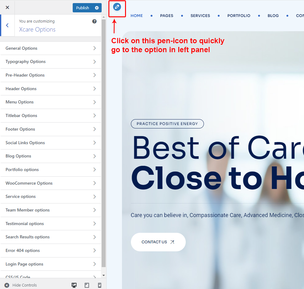 Xcare Options (Theme Options) panel is created with WordPress' Customize section. We added our own options with WordPress' default options.