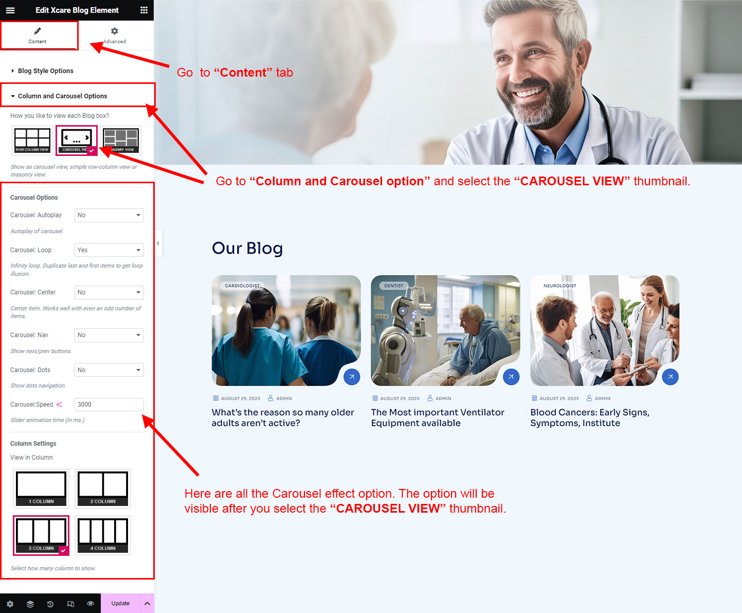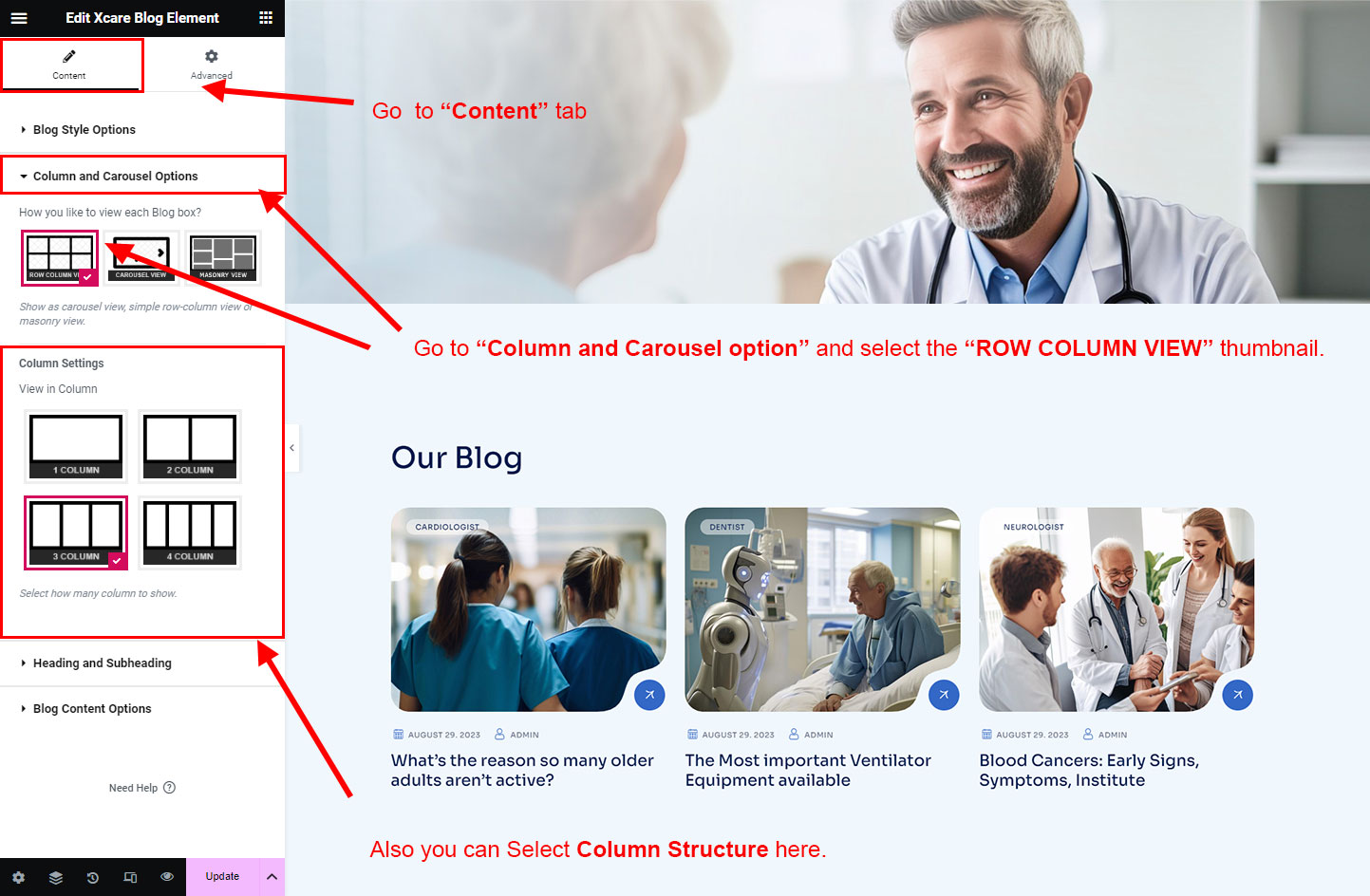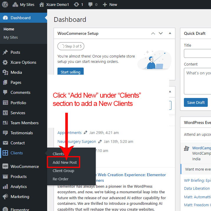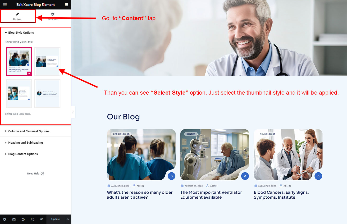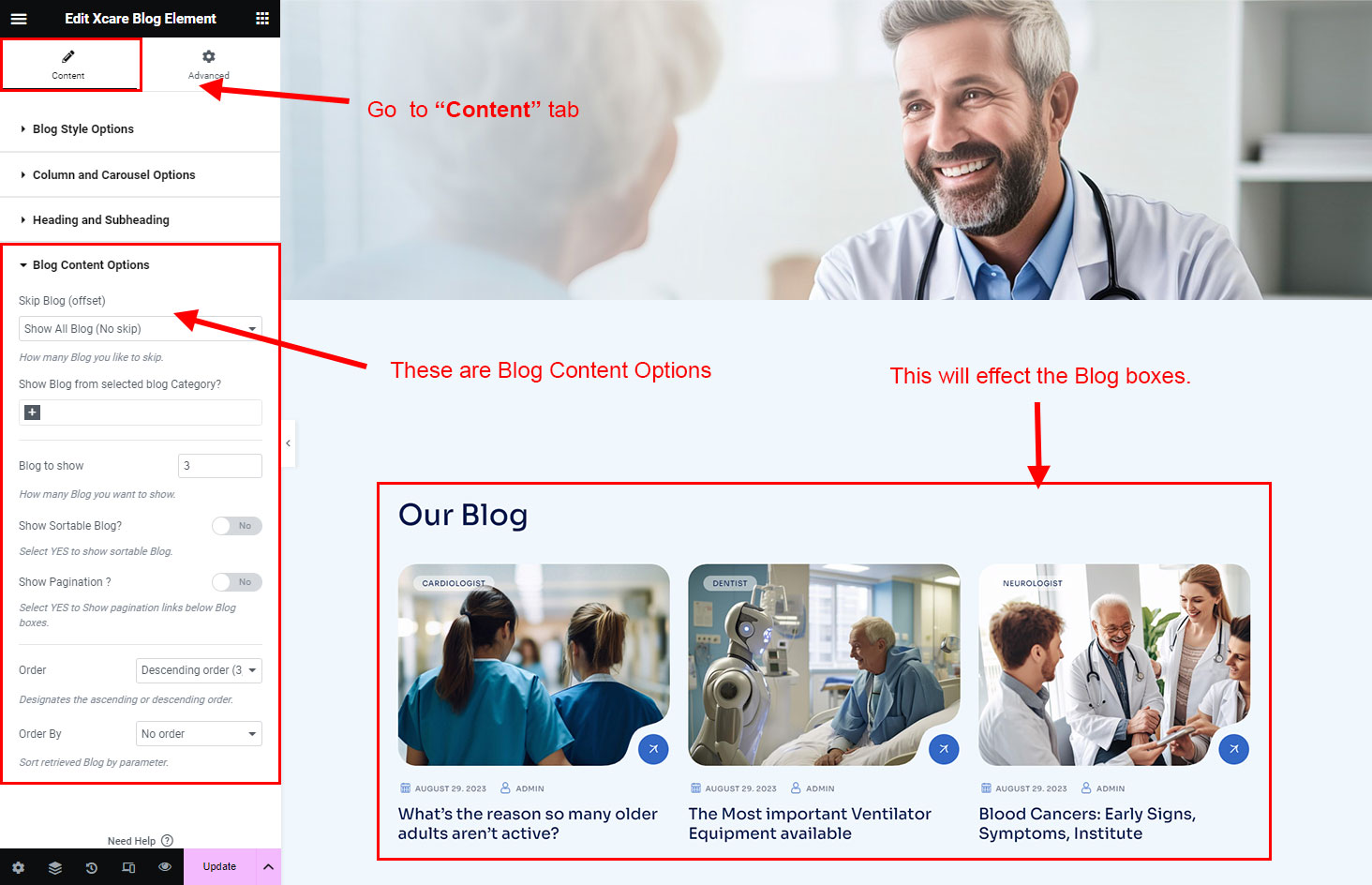 We created a Blog Element in Elementor Page Builder which you can use to show post on any page you want. Just drag and drop the Xcare Blog Element on any page and the post list will appear.