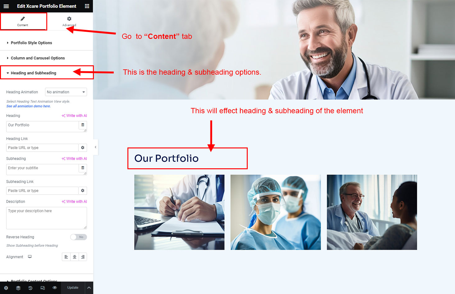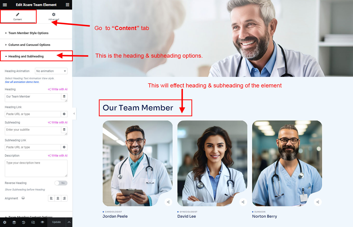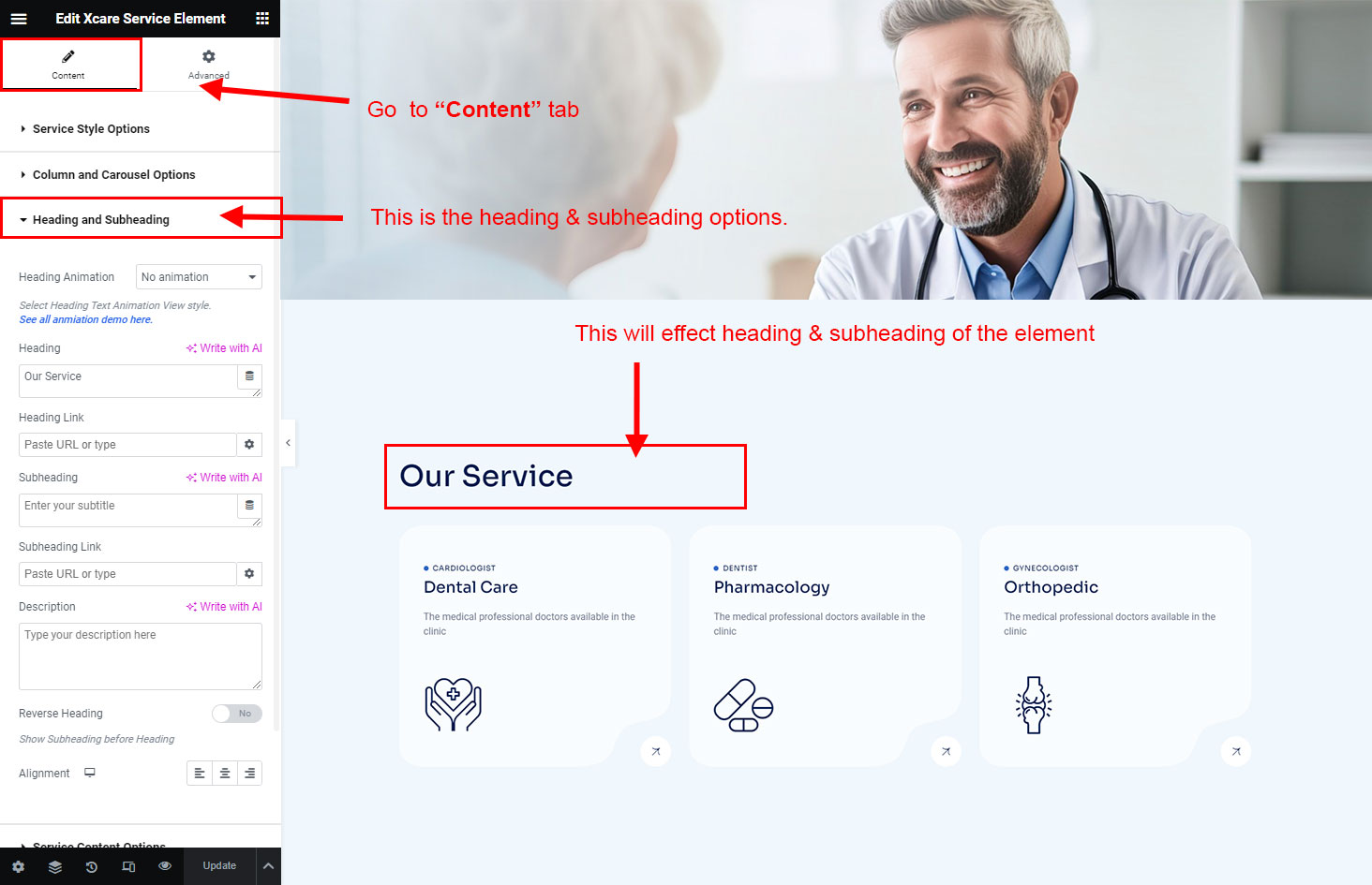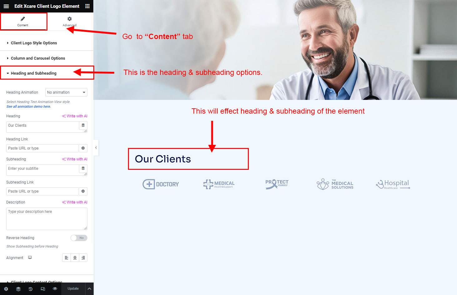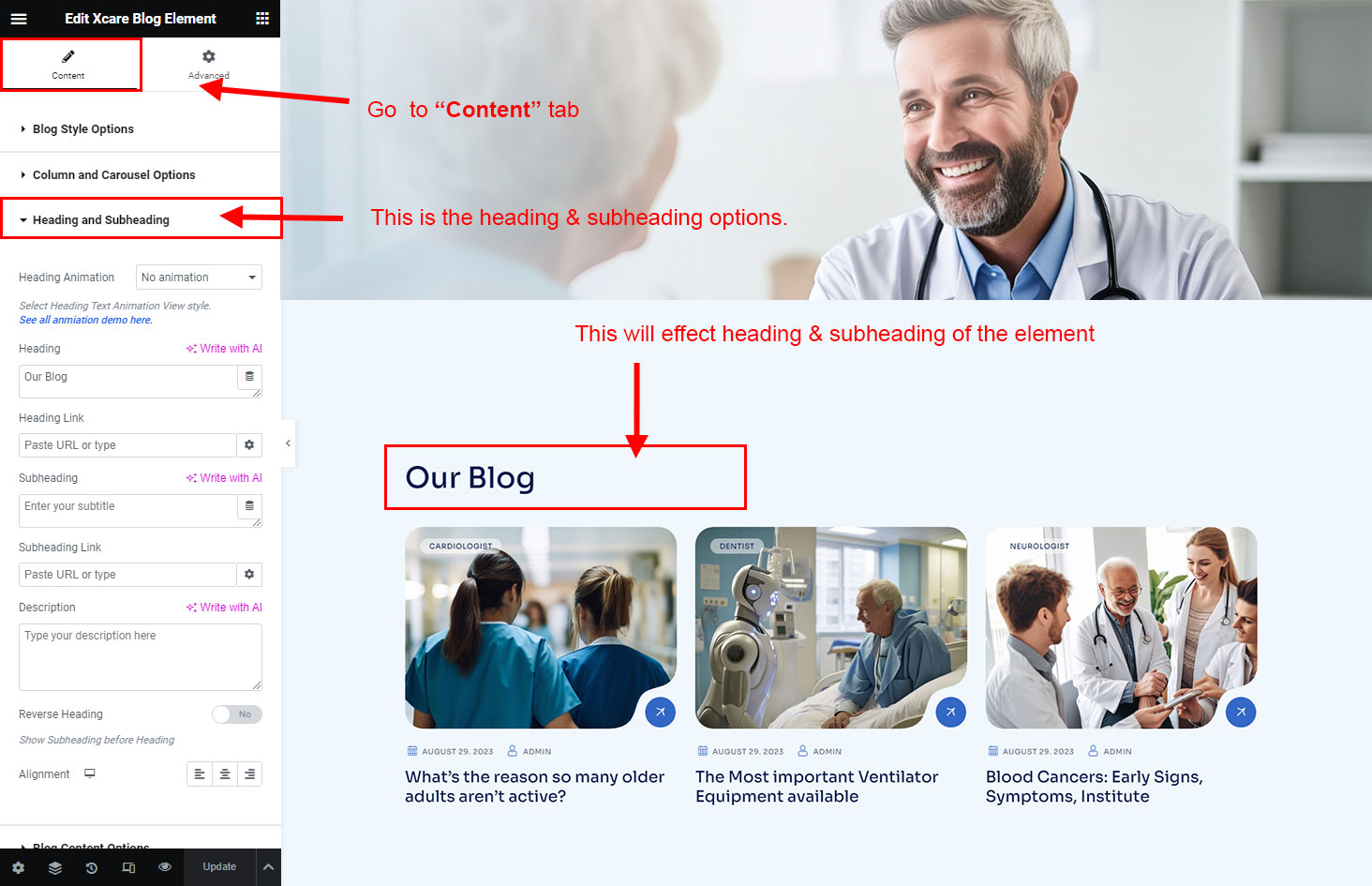 The heading and subheading will appear at top of the element. You can change text, add link to the heading or subheading, change alignment, change tag (for SEO purpose) etc.
