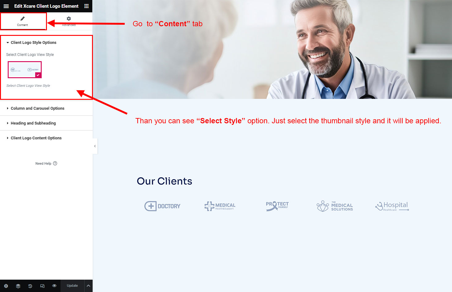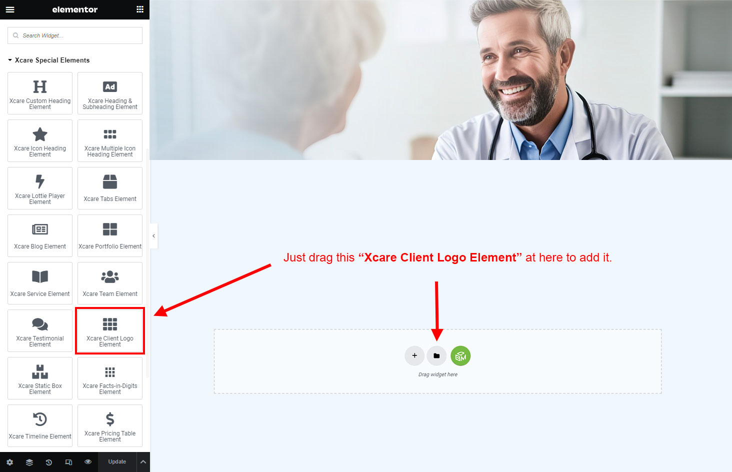 Now we have some Client Logo posts. So we can show all Client Logo on a page. Create a new page and add Xcare Client Logo Element on a page by dragging it.
