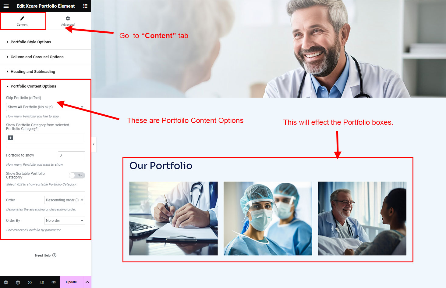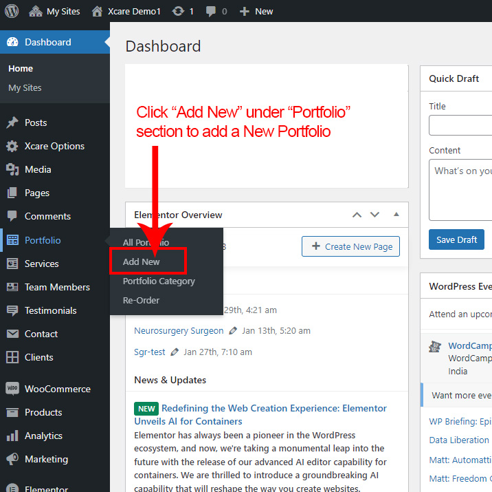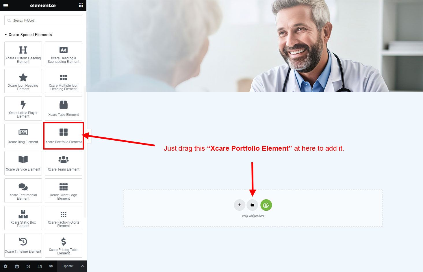Now we have some Portfolio posts. So we can show all Portfolio on a page. Create a new page and add Xcare Portfolio Element on a page by dragging it.