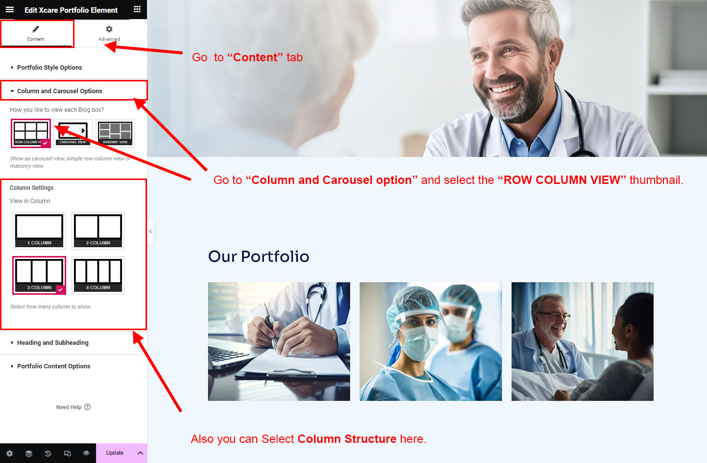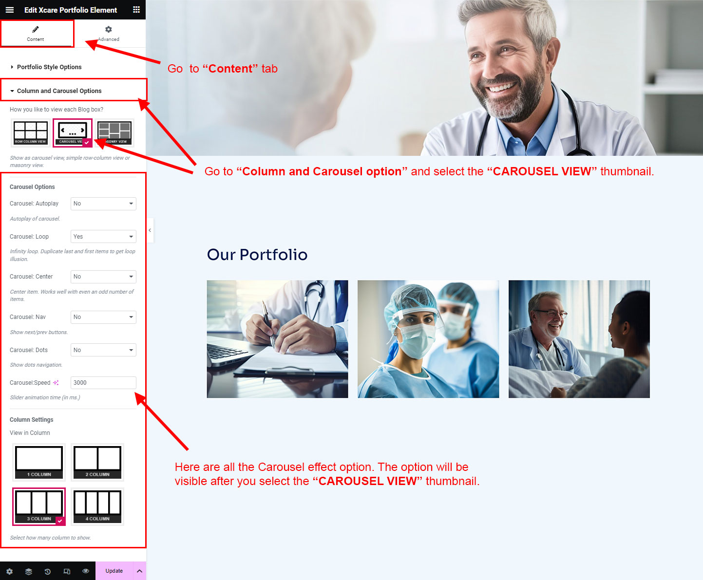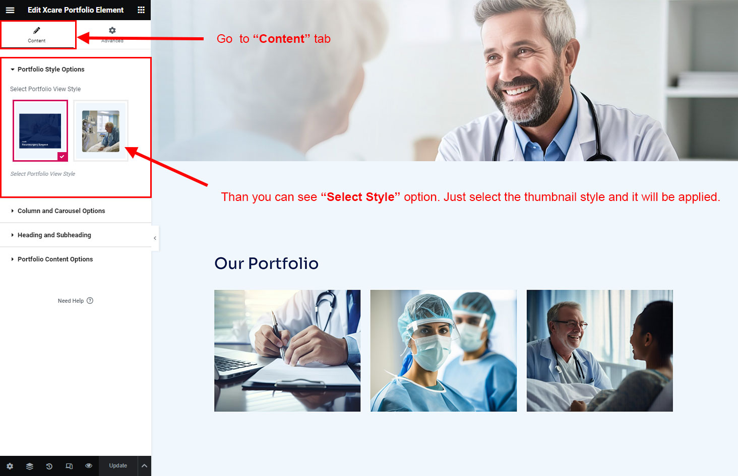 Now we have some Portfolio posts. So we can show all Portfolio on a page. Create a new page and add Xcare Portfolio Element on a page by dragging it.