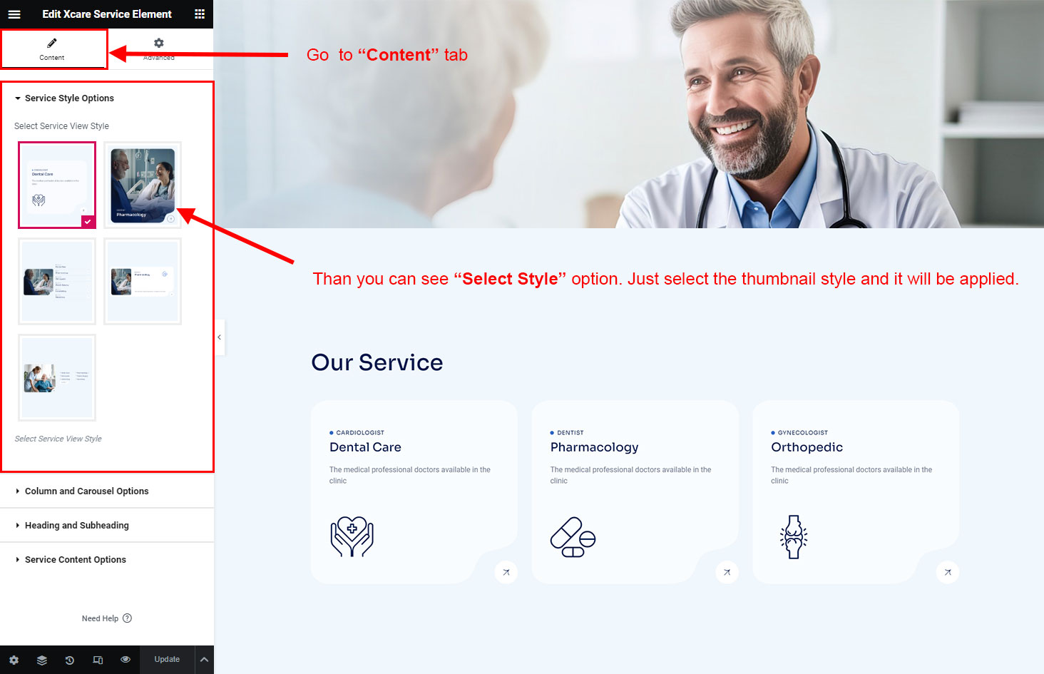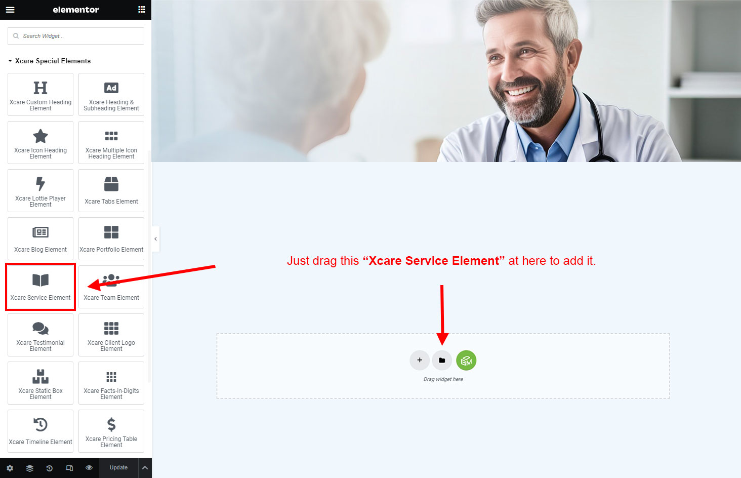 Now we have some Service posts. So we can show all Service on a page. Create a new page and add Xcare Service Element on a page by dragging it.