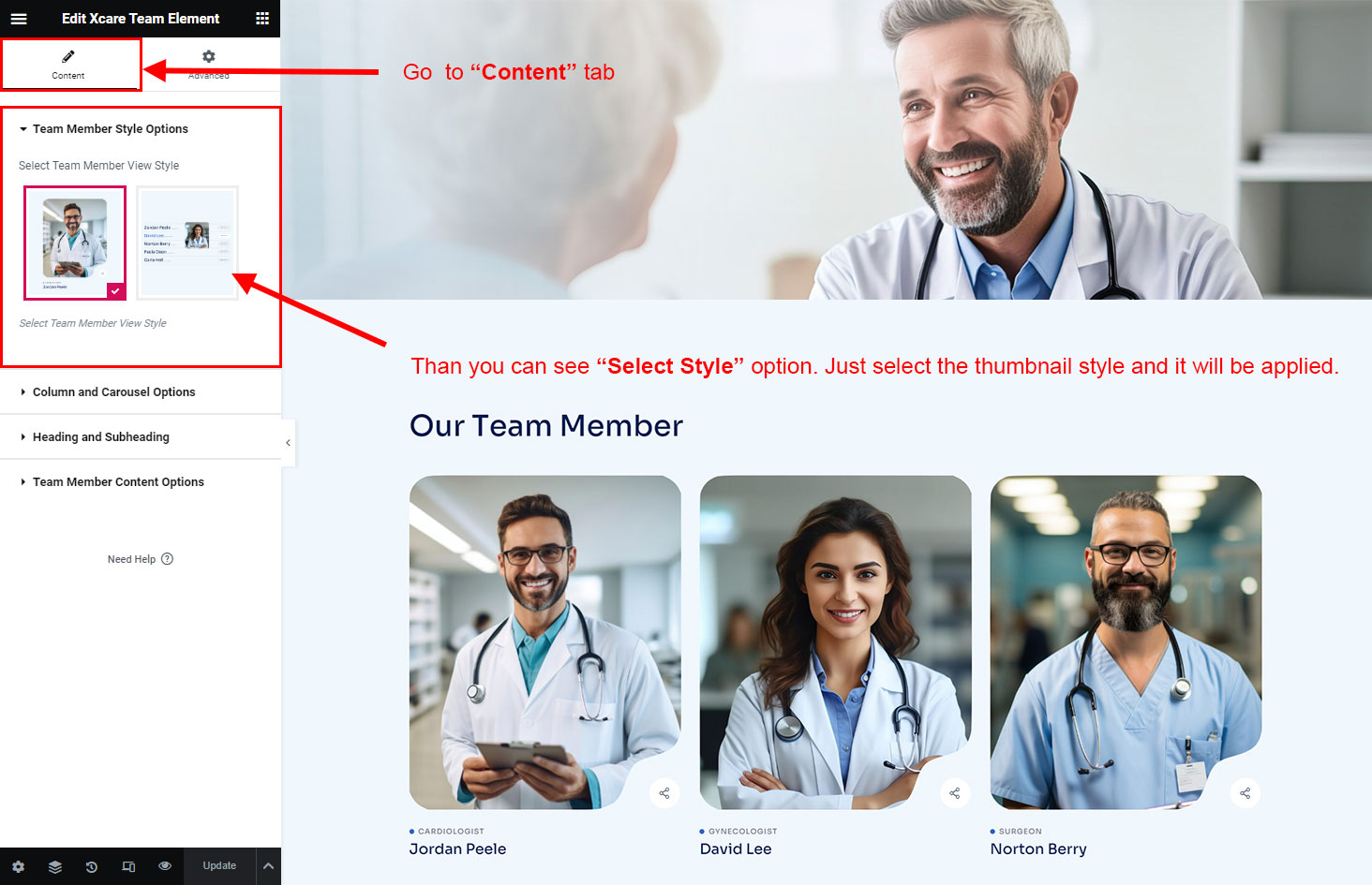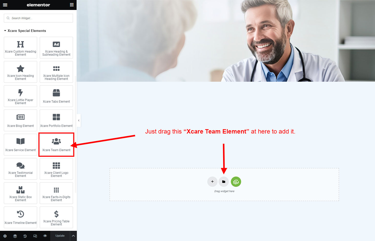Now we have some Team posts. So we can show all Team on a page. Create a new page and add Xcare Team Member Element on a page by dragging it.