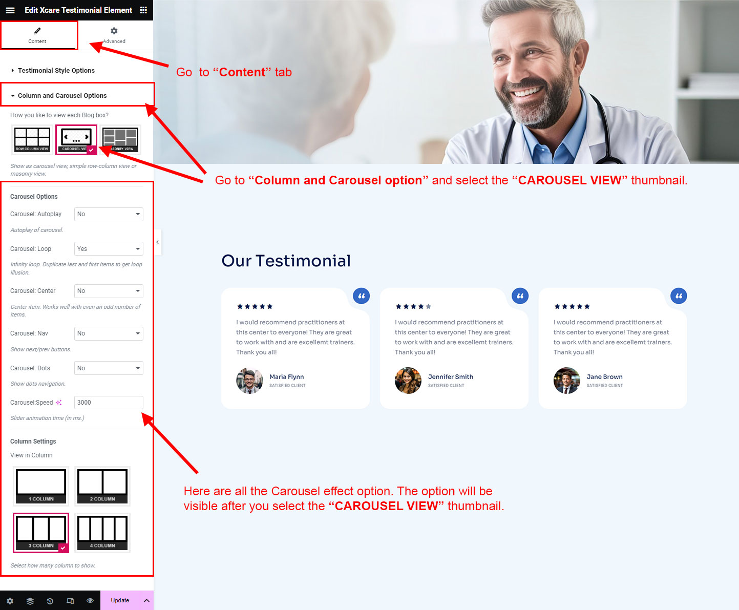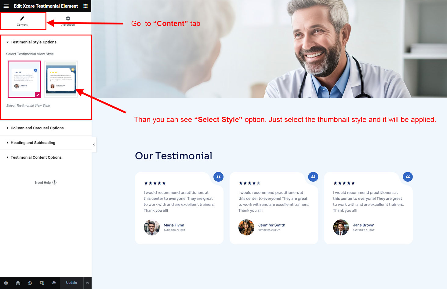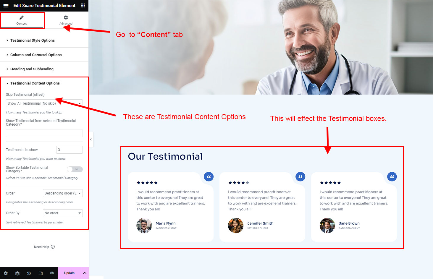 You can select the testimonial options here. Like how many testimonial you like to show, show testimonial from selected group (category), testimonial order etc.