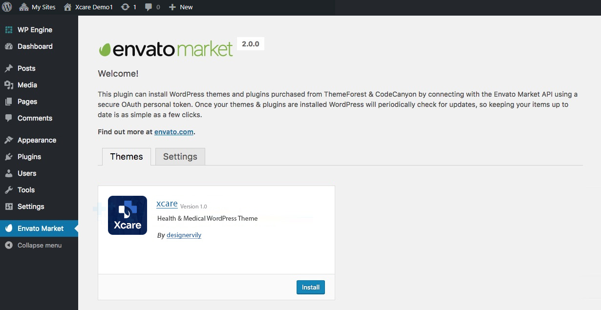 Once your token is saved and validated your page will refresh to show your Envato Market landing page with added tabs for your items. The added tab(s) display all of your theme and plugin purchases as well as their version numbers and quick links to the theme and author pages. So now you can install theme and also update theme in just one click.