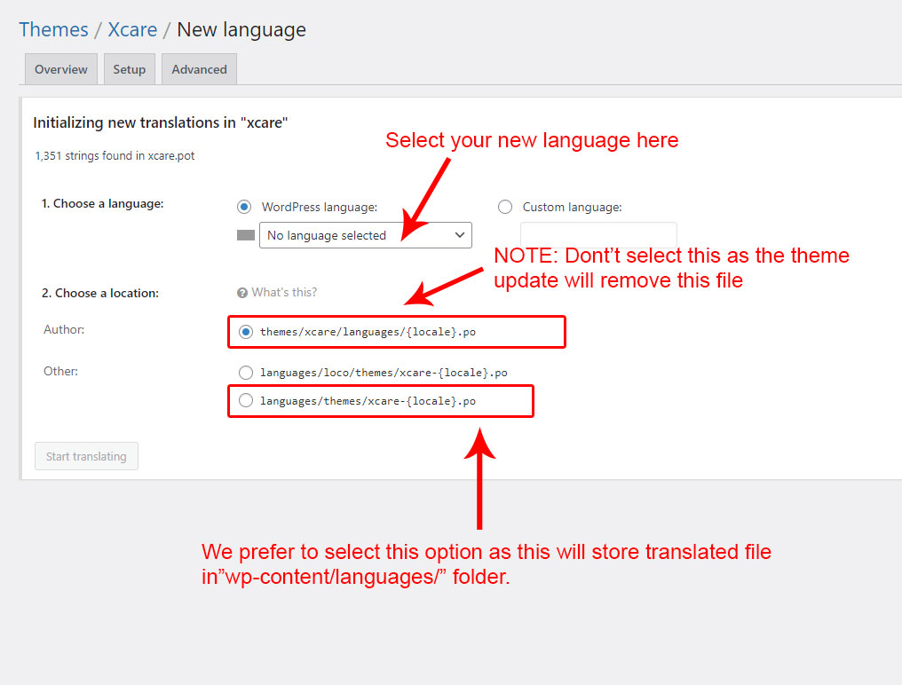 3. Now go to Loco Translate section and click on Xcare theme.
