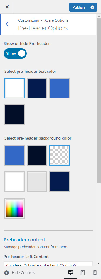 Pre-header section will appear above header area. You can show or hide it globally from Xcare Options >> Pre-header Settings section.