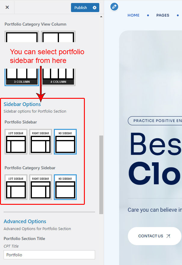 You can select the portfolio options here. Like how many portfolio you like to show, show portfolio from selected category, portfolio order etc.