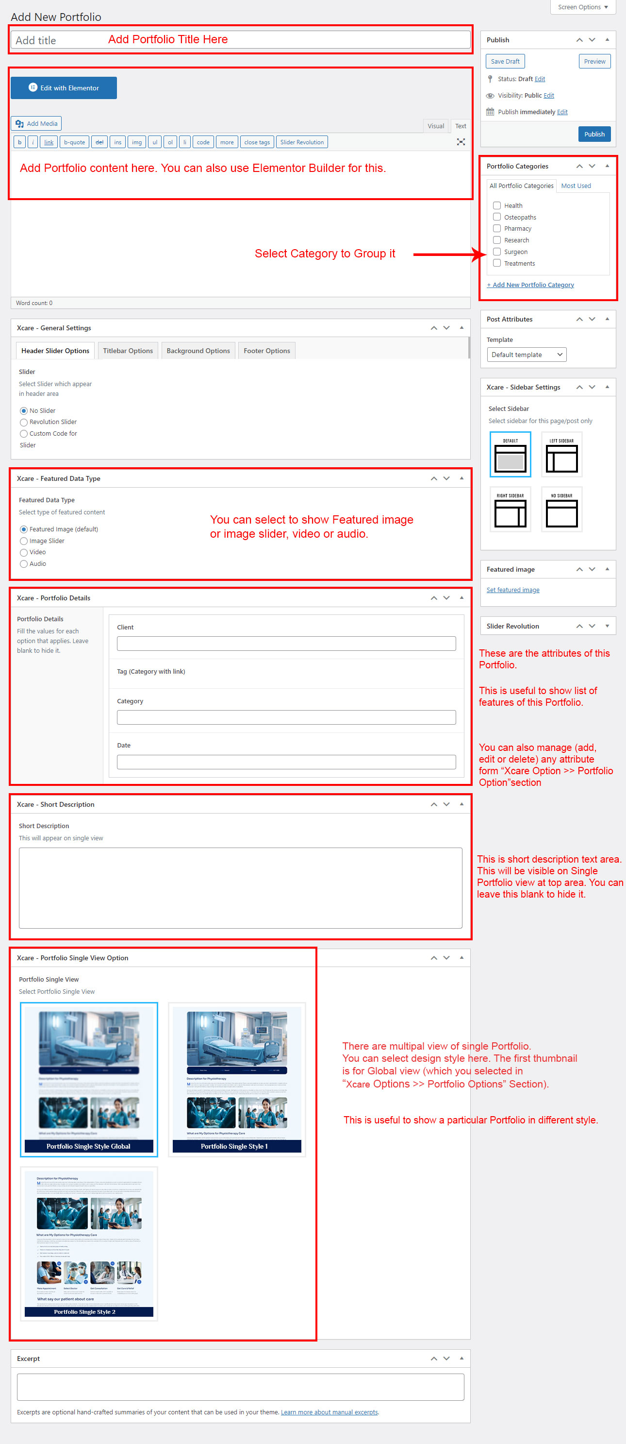 If you already done demo content setup than you can edit existing portfolio and check how we added data so you can understand each option perfectly.