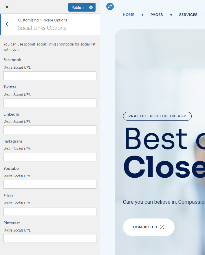 This shortcode specially created to show social links. You can set social links in Xcare Options >> Social Links Section and write your social links. Than it can be shown using [pbmit-social-links] shortcode.