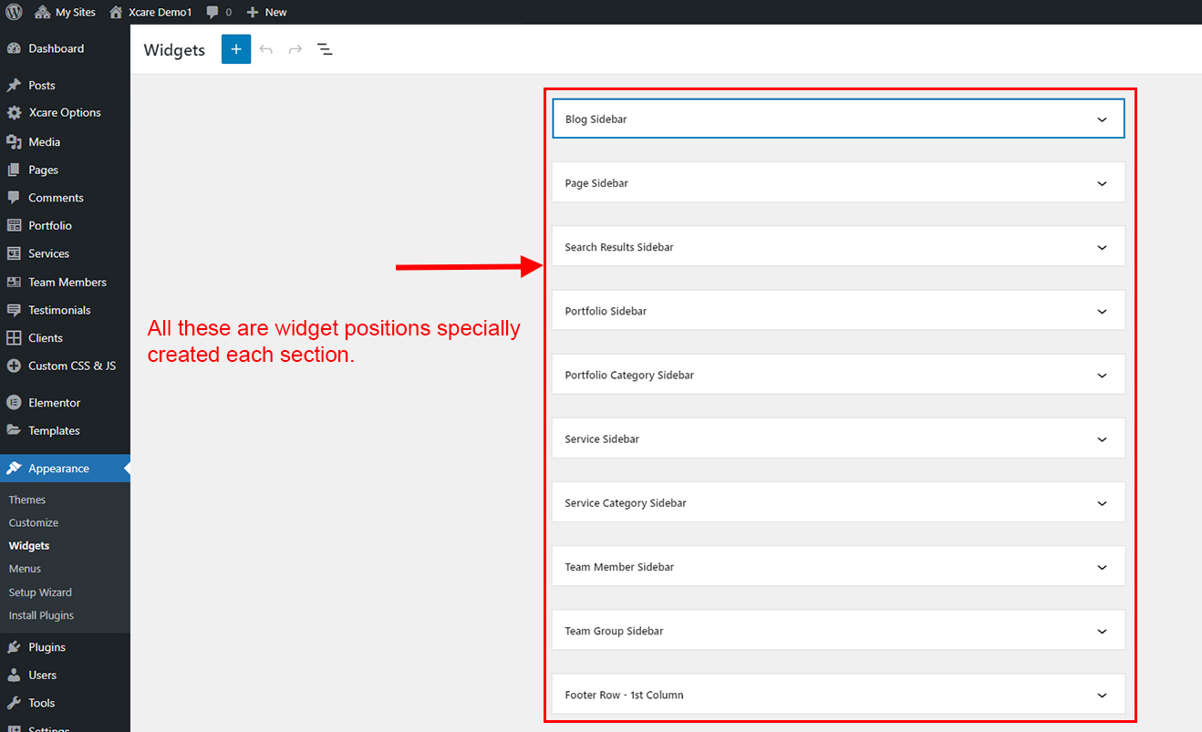 Xcare theme comes with widgets and different positions. We created special widget positions for each section so you can show sidebar and footer widgets properly according to content. Here are description of all widget positions: