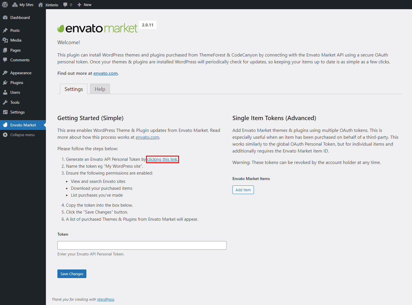 • To get started click on the "Envato Market" link in your dashboard menu. You should see a screen similar to the one below. The very first step is to create an Envato API token. To do this, click on the generate a personal token link (highlighted in red below).
