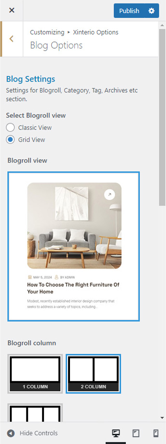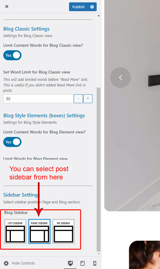 You can set Blog view style here. You can also set other options like Social Share links (like share on Facebook, Twitter etc), limit post text, set Blog page Sidebar etc. The Blog page is the page which you set in Appearance >> Settings >> Reading >> Posts Page option.