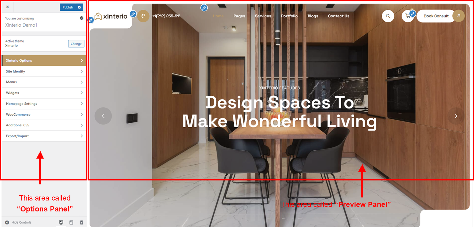 After clicking on the Xinterio Options panel you will redirected to the Customize section. It has two sections. Left area called "Options Panel" and the right area called "Preview panel". See screenshot given below: