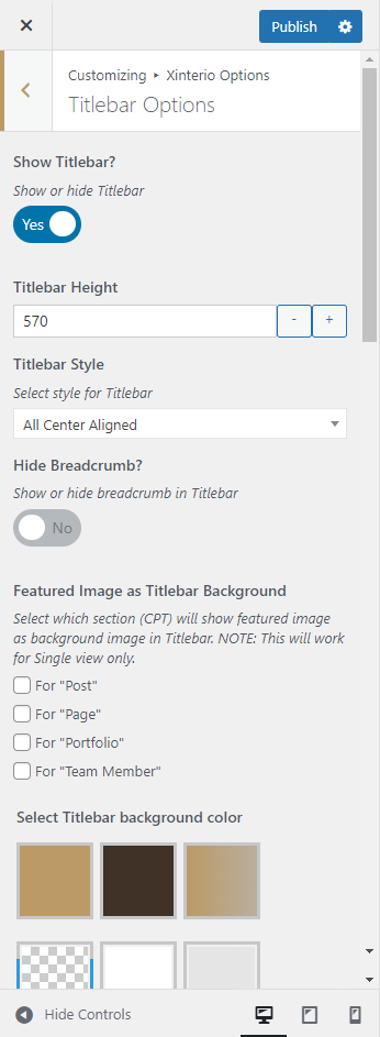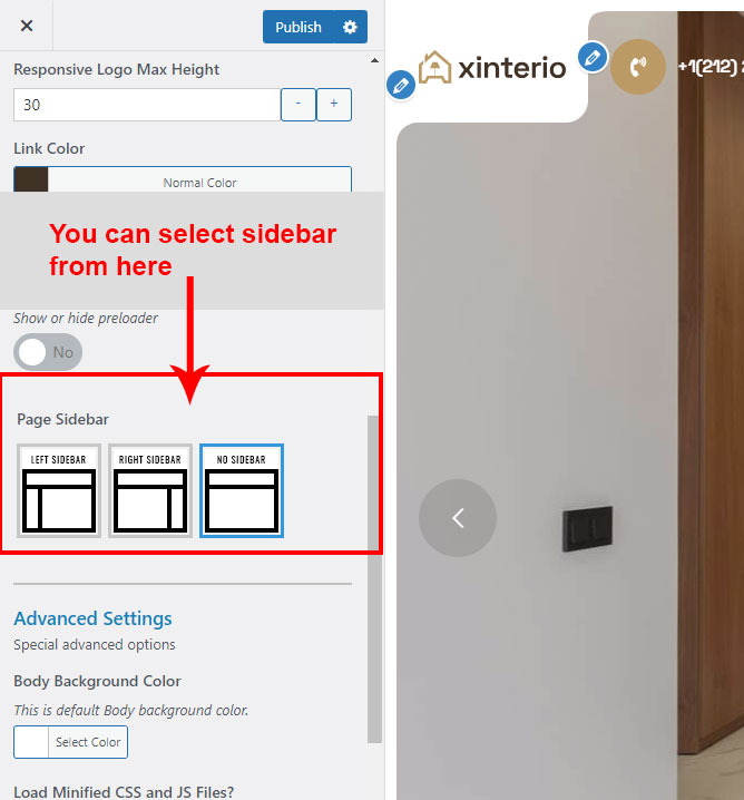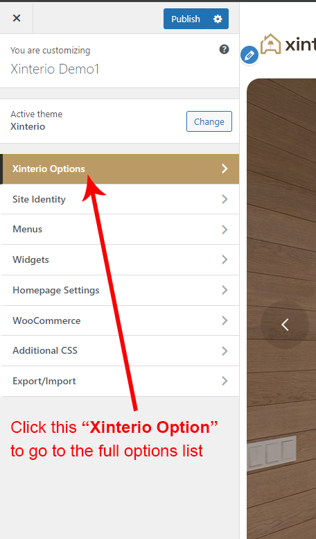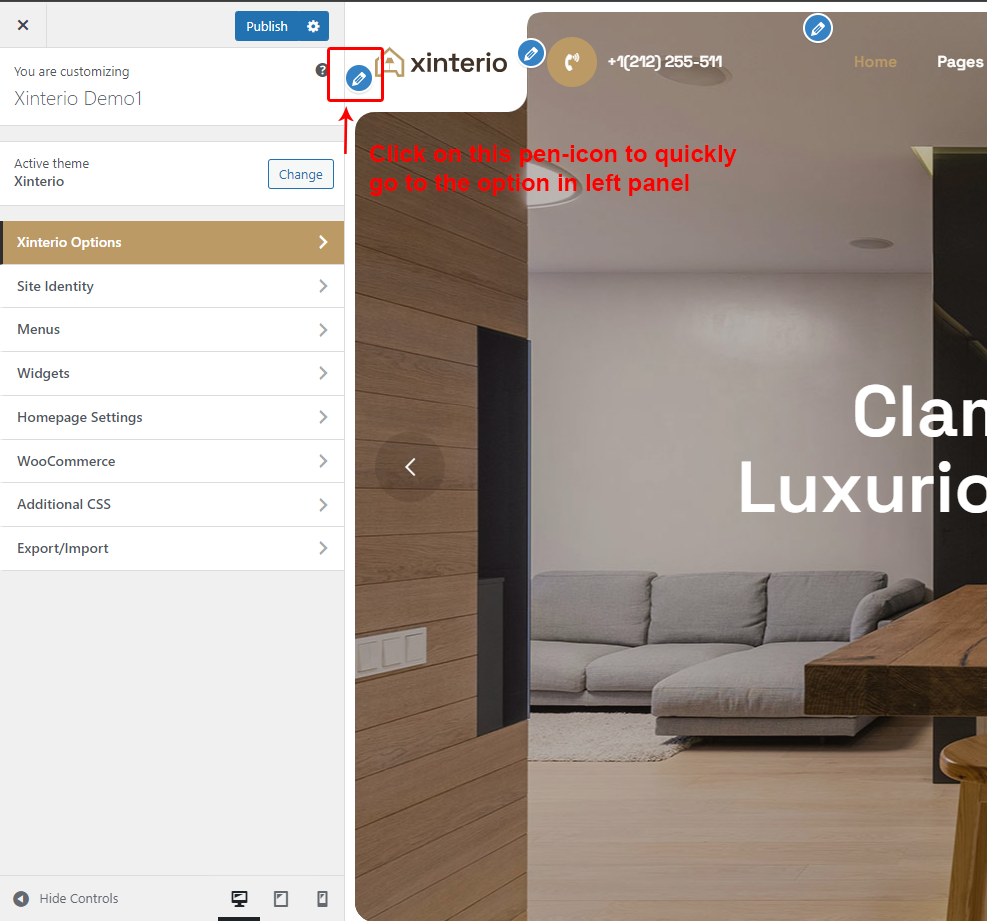 Xinterio Options (Theme Options) panel is created with WordPress' Customize section. We added our own options with WordPress' default options.