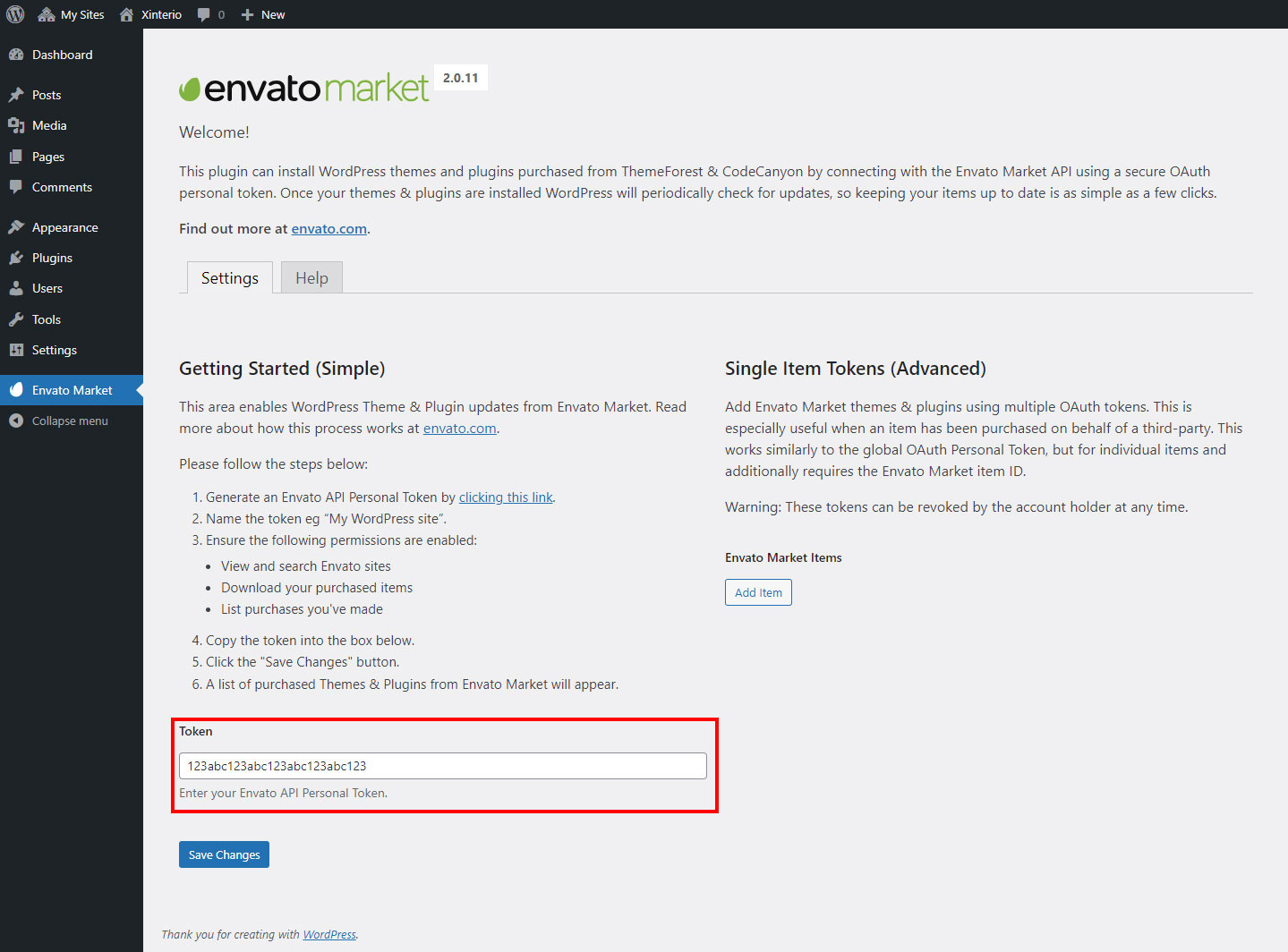 • Now go back to your WordPress installation and paste in your Envato API token then click save.