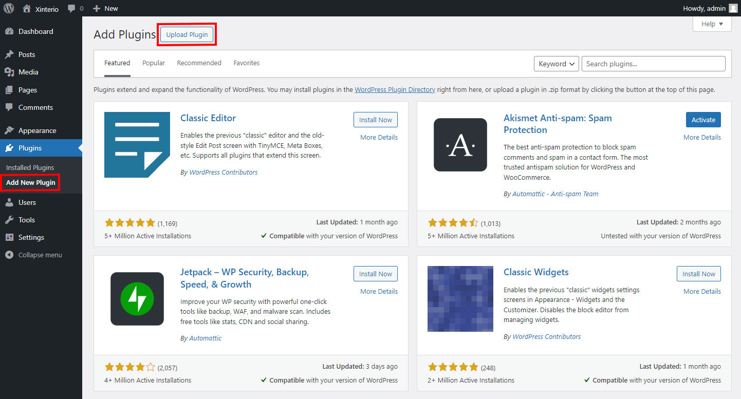 • To install the plugin navigate to Plugins > Add New and click on the Upload Plugin button at the top of the page: