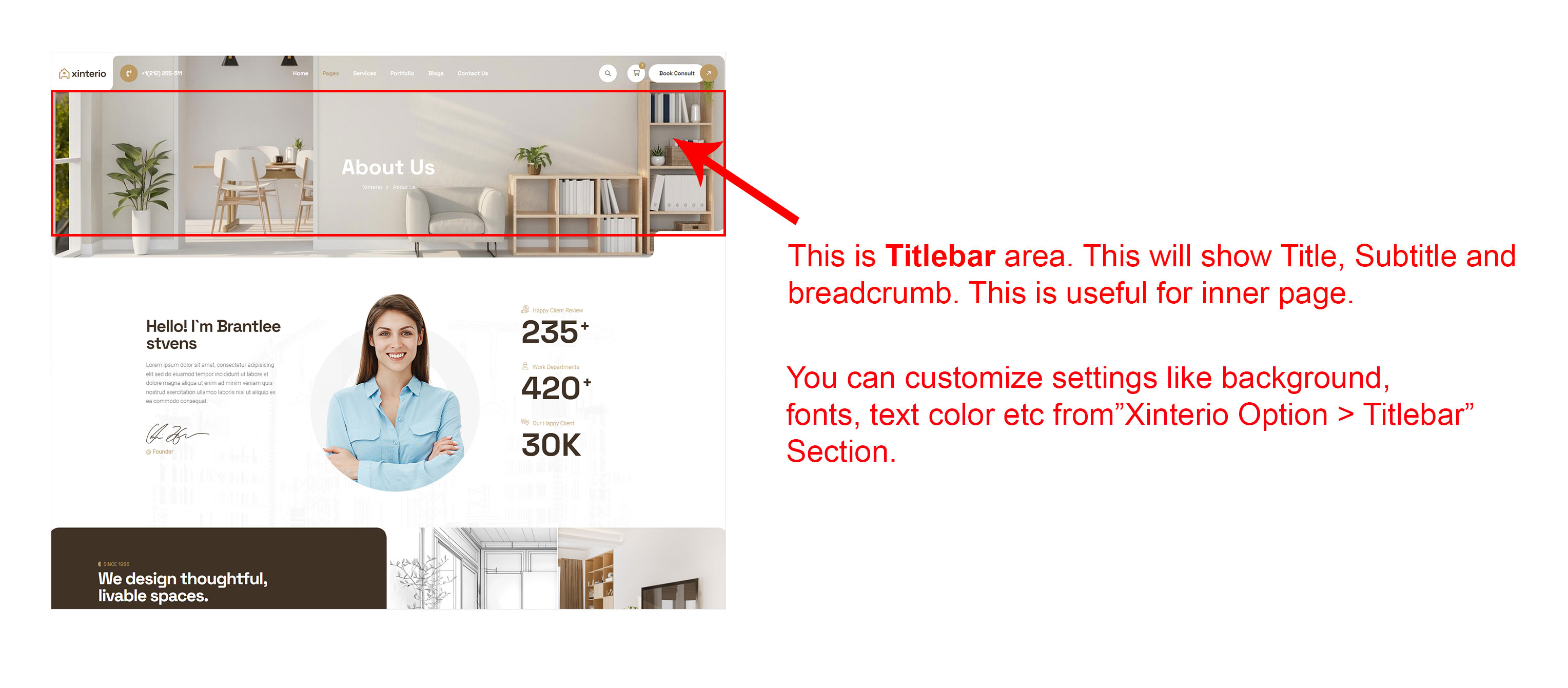 Generally the Titlebar will appear on inner page. This will appear below header area. This will show page title, subtitle and breadcrumb. (Where is Titlebar?)
