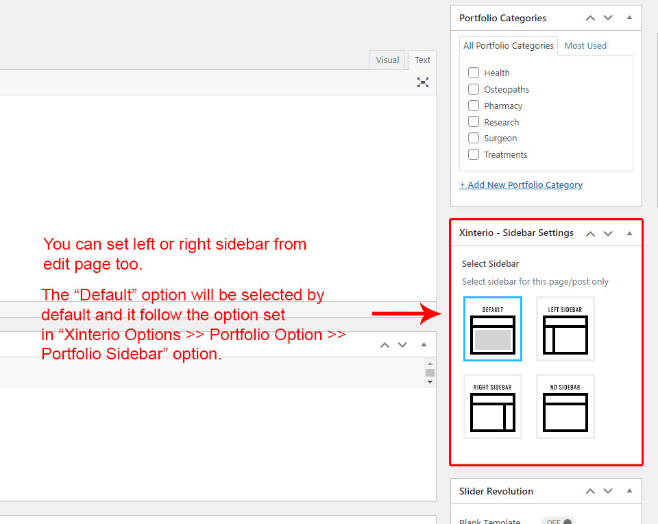 This section contains options related to Portfolio section. You can select view of Single Portfolio. Also other options like show or hide Related Portfolio, Portfolio view on "Portfolio Category" page, Sidebar view on Single Portfolio and Category view etc.