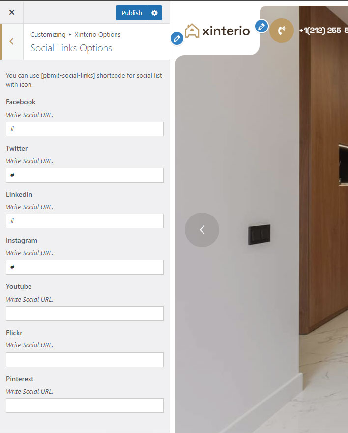 This shortcode specially created to show social links. You can set social links in Xinterio Options >> Social Links Section and write your social links. Than it can be shown using [pbmit-social-links] shortcode.