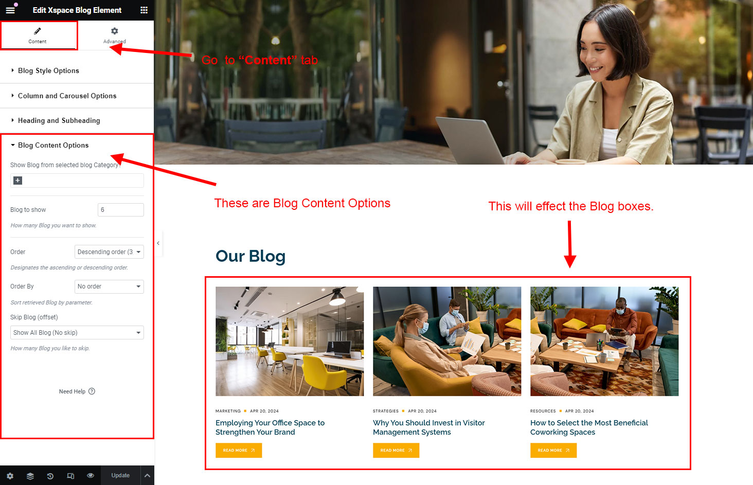 We created a Blog Element in Elementor Page Builder which you can use to show post on any page you want. Just drag and drop the Xspace Blog Element on any page and the post list will appear.