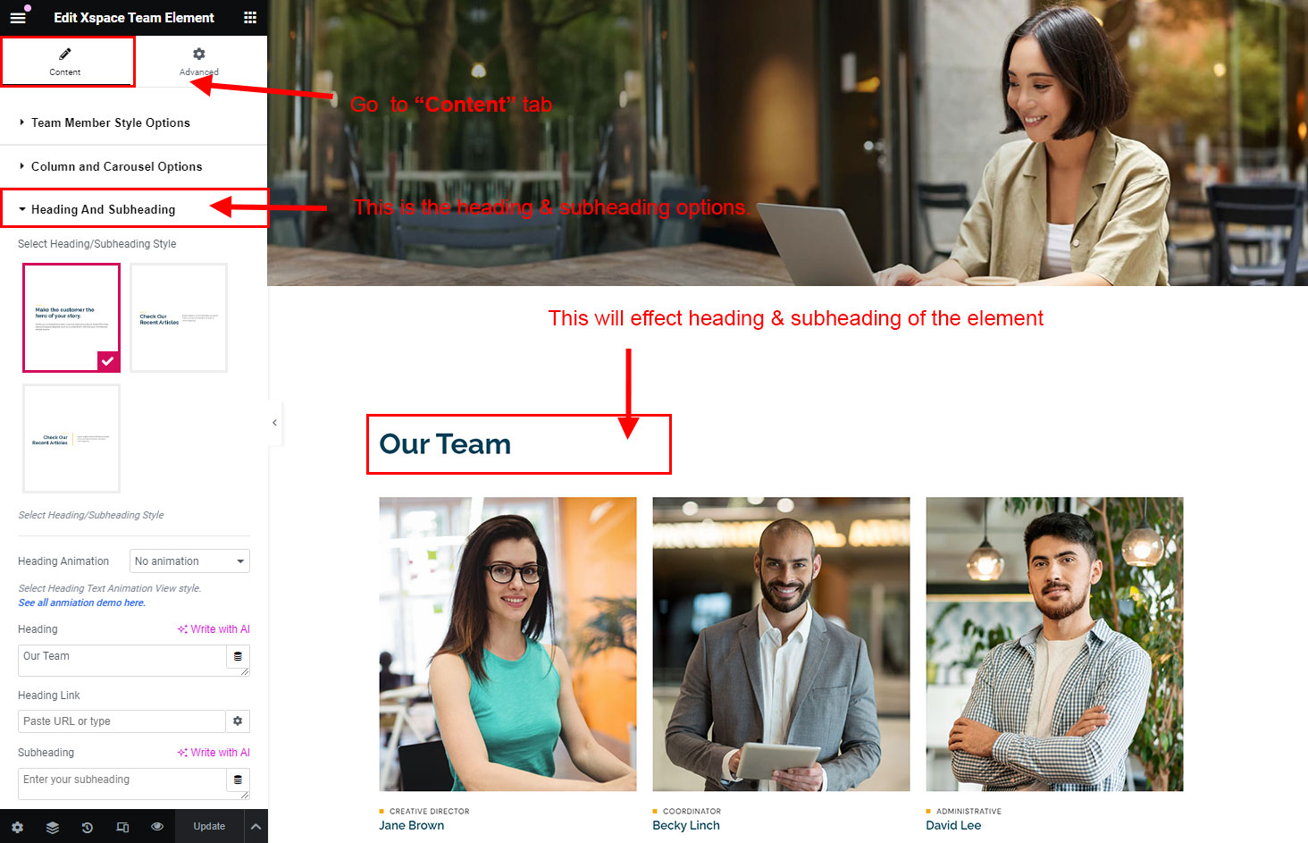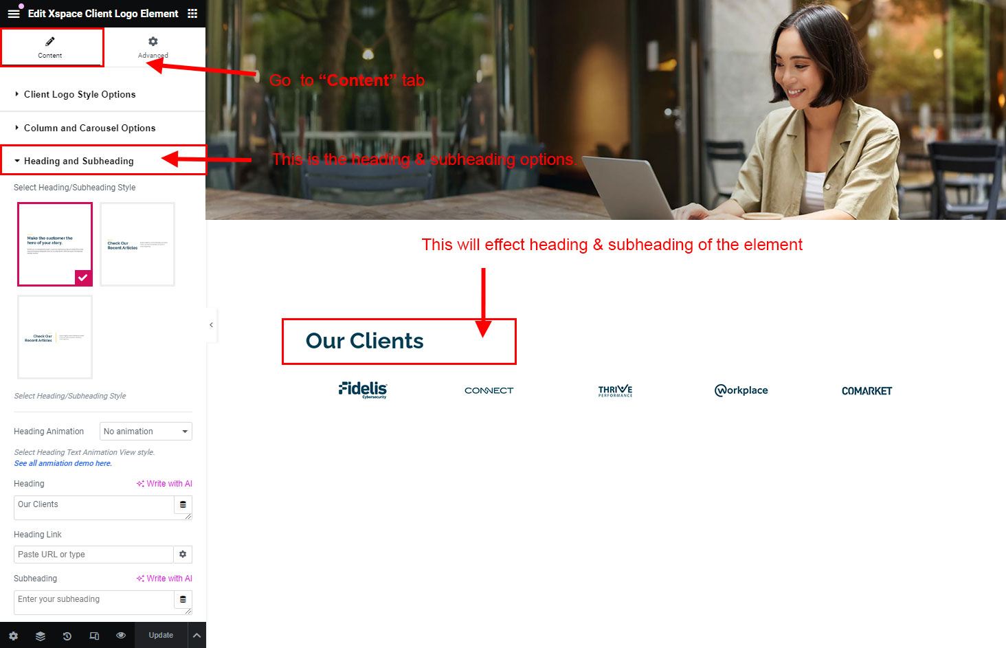 The heading and subheading will appear at top of the element. You can change text, add link to the heading or subheading, change alignment, change tag (for SEO purpose) etc.