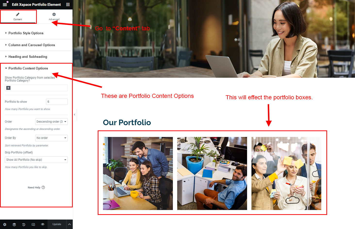 You can select the portfolio options here. Like how many portfolio you like to show, show portfolio from selected category, portfolio order etc.