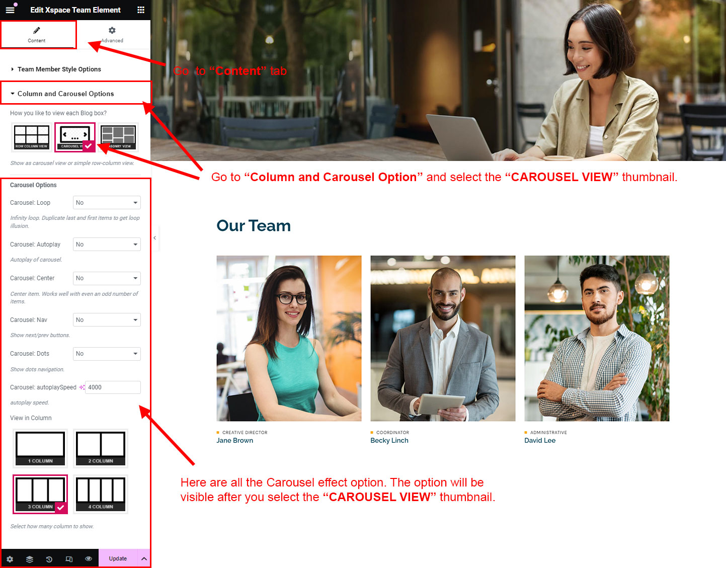 CAROUSEL VIEW: The Carousel view will be animated sliding view. There are lot's of options for the slideing animatins. Like animation speed, animation column, auto-play on or off, Loop post boxes, show/hide the dot or arrow navigation etc.