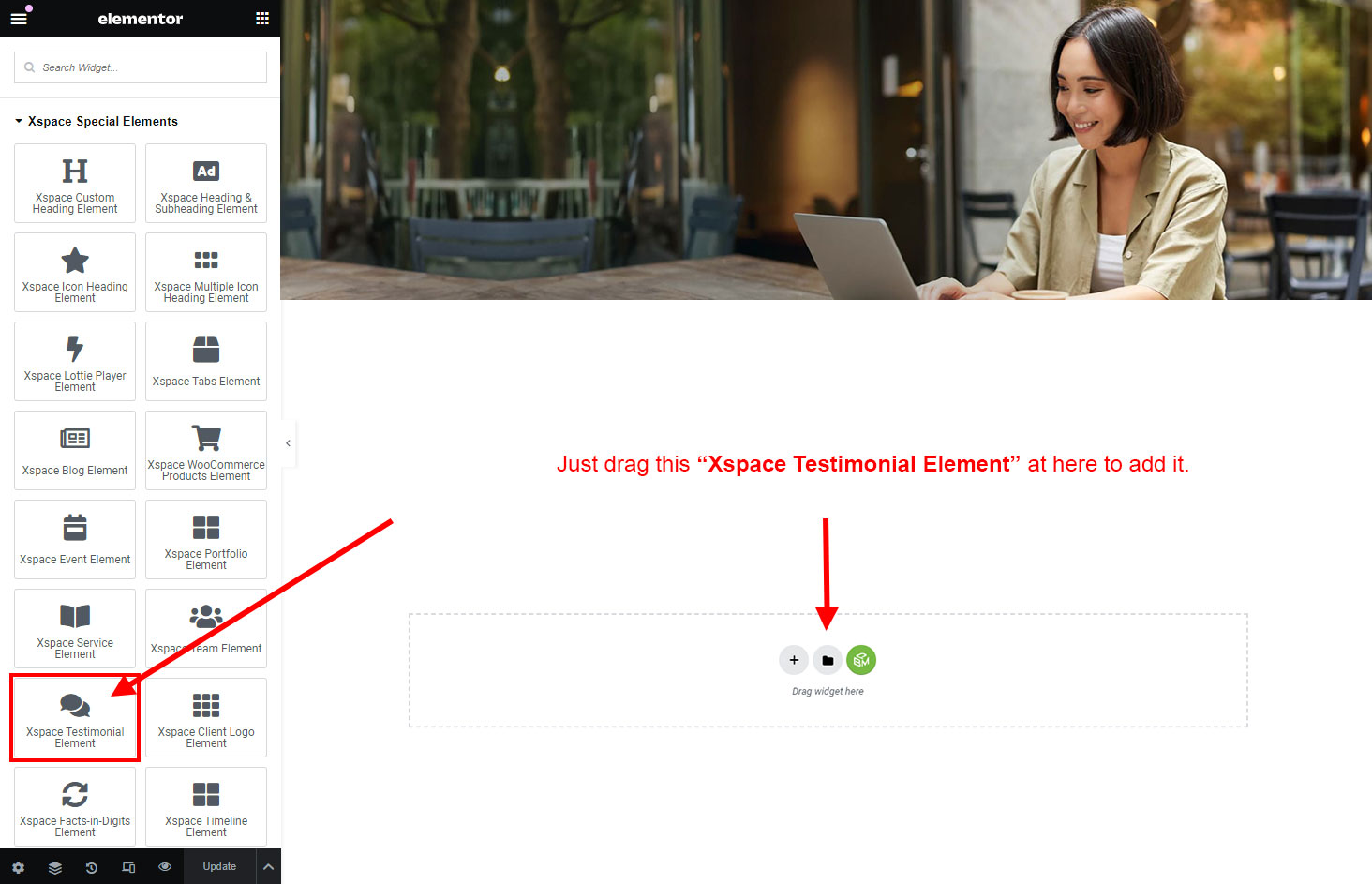 Now we have some Testimonial posts. So we can show all Testimonial on a page. Create a new page and add Xspace Testimonial Element on a page by dragging it.