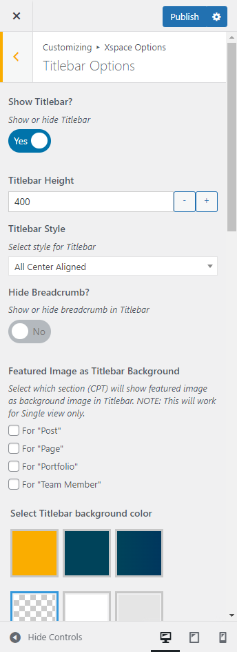 This will override the options set under Xspace Options > Titlebar Settings options. This will help you to set special design the Titlebar on specific page or post.